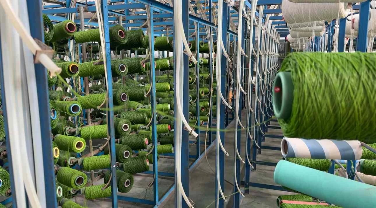 10 production lines producing 1.5M+ sqm monthly. Custom Dtex, density, and colors available (MOQ 3000 sqm).
